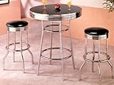 This set offers dining options that are colorful, contemporary, and just right for everyday use. The chairs and stools have an easy care faux leather finish while the tables have a shiny easy care dining surface. Choose regular height or bar height dining with contrasting deep colors and metal frame that will brighten up any room and last for many years.- Bar Table:30" Diameter x 41 3/4"H, Bar Stool:14 1/4"L x 14 1/4"W x 29"H