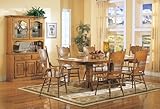 This beautiful dining set will be a lovely addition to your breakfast nook or casual dining room The traditional oak table features a smooth oval top with two 18 inch center leaves so you can easily extend the length of the table from 60 inches long to 78 or 96 inches long so you can accommodate dinner guests A double pedestal trestle base with pretty turned spindles The traditional Victorian oak chairs will fit nicely into your room with splat backs featuring an intricate pressed design a.