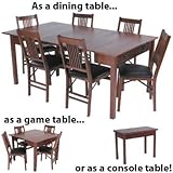 Get three kinds of tables from this one amazing expandable table! This beautifully finished table starts as a console table perfect for the entryway or living room. The top flips up to extend this table into the perfect square game table to play board games or card games with your friends and family. When you add the additional two 16" leaves (included) this table becomes a rectangular dining table capable of seating 8. This table is a space saver. This dining table is great for people who don't have two separate dining areas. Use the dinette/game size table for everyday use and the dining room table size for when company comes over. The finishing process is a 3 step sprayed on finish and top coat. Please note: The drawers do not open, they are drawer fronts for decoration only. The chairs and table are made from solid Brazilian hardwood, then stained with a water-based stain, and finally sealed with a varnish. The chairs' seat is black vinyl and folds to save you space. These chairs are sold in a set of 2. Chairs are sold separately. As a Console: 30"H x 40"W x 20"D. Legs require moderate construction. As a Dinette/Game: 30"H x 40"W x 40"D. As a Dining Table: 30"H x 40"W x 72"D. Chair Open: 36.125"H x 16.5"W x 19.25"D. Chair Folded: 36.125"H x 16.5"W x 7"D. Assembly level/degree of difficulty: Moderate.- Color: Fruitwood